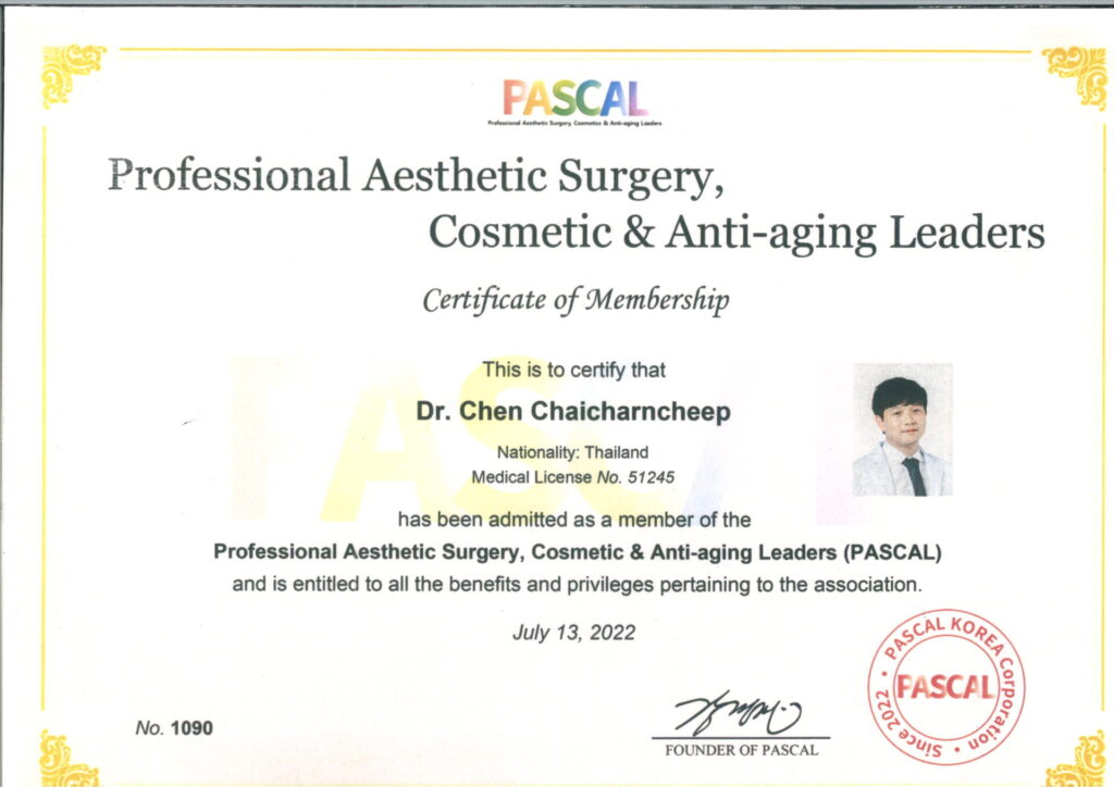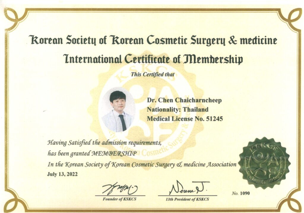 ได้รับการรับรองเป็นสมาชิกสมาคม Korean Society of Korean Cosmetic Surgery & Medicine (KSKCS) ซึ่งเป็นองค์กรวิชาการด้านศัลยกรรมความงามของประเทศเกาหลีใต้ การเป็นสมาชิกสะท้อนถึงการมีส่วนร่วมในเครือข่ายวิชาชีพนานาชาติ และการพัฒนาความรู้ทางศัลยกรรมความงามอย่างต่อเนื่อง